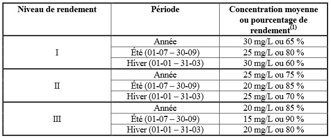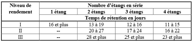 Pour uniformiser les exigences de rejet, les étangs aérés sont classés en trois niveaux de rendement en fonction du nombre d’étangs en série et du temps de rétention total avant majoration pour l’accumulation