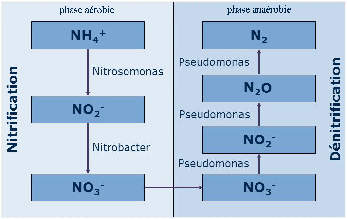 Le processus de dénitrification est le mécanisme en jeu pour la réduction des formes azotées.