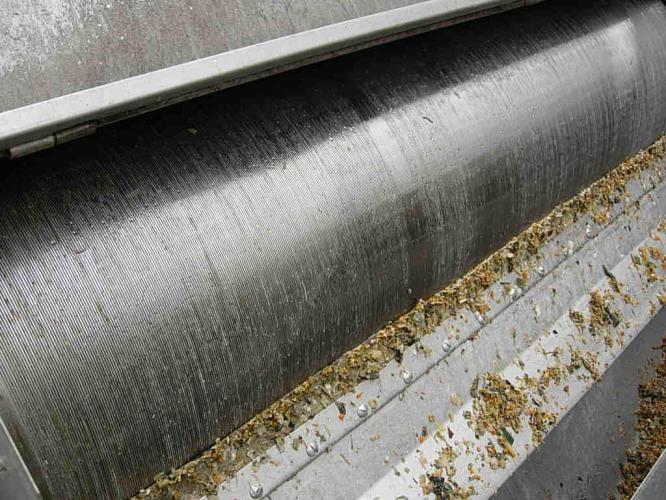 présente sous la forme d’un tambour qui est constitué d’une grille à fissure cintrée et qui tourne autour de son axe horizontal. L’effluent est déversé sur le tambour.