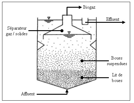 une couverture de boue granulaire qui suspend dans le réservoir. L'écoulement des eaux usées vers le haut à travers la couverture est traité (dégradé) par