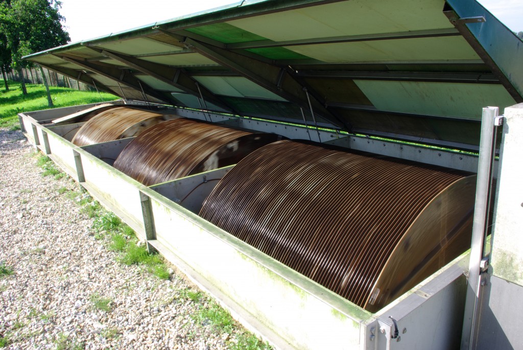 d’arrosage rotatif. Les eaux traitées sont récupérées par un système de drains de sortie avant d’être acheminées vers un bassin de décantation finale. Une partie de cette